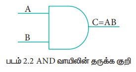 இரண்டு உள்ளீடுகளும் மெய்யெனில் மட்டுமே இதன் வெளியீடு மெய்யாக இருக்கும் அல்லது பொய்யாகிவிடும். அதாவது உள்ளீடுகள் அனைத்தும் 1 என்ற மதிப்பிலிருந்தால் இதன் வெளியீடு 1-ஆக இருக்கும் அல்லது 0 - ஆகிவிடும். A மற்றும் B என்ற மாறிகளில் உள்ளீட்டையும், C என்ற மாறியில் வெளியீட்டையும் அறிவித்தால், A மற்றும் B மாறிகள் 0 அல்லது 1 என்ற மதிப்பை ஏற்கும். AND வாயிலின் தருக்க குறி.