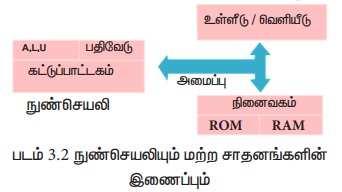 ● படம் 3.2ல் கொடுக்கப்பட்டுள்ளதைப் போல், நுண்செயலியால் நினைவகம், உள்ளீடு மற்றும் வெளியீடு சாதனங்களோடு தொடர்பு கொள்ள முடியும். பாட்டை என்னும் அமைப்பானது கம்பிகளின் குவியலாகும். இது முகவரி பாட்டை தரவு பாட்டை மற்றும் கட்டுப்பாட்டு பாட்டை ஆகியவற்றின் திரட்டாகும். இது, நுண்செயலி பிற சாதனங்களோடு தொடர்பு கொள்ளும் பாதையாக வேலை செய்கிறது.