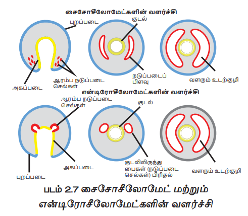 விலங்குகளில், அமைந்துள்ள உடற்குழியானது விலங்குகளை வகைப்பாடு செய்வதில் முக்கியத்துவம் பெற்றுள்ளது. பெரும்பாலான விலங்குகளில் உடற்குழியானது உடற்சுவருக்கும் உணவு குழலுக்கும் இடையில் அமைந்துள்ளது (படம் 2.6). இது நடு அடுக்கிலிருந்து தோன்றுகிறது. உடலில் உடற்குழியை பெற்றிராத விலங்குகள் உடற்குழியற்றவை (Acoelomates) எனப்படும். இதில் உடற்குழி இல்லாததால் உடல் சற்றுத் திடத் தன்மையுடன் உள்ளுறுப்பு சூழ்குழியற்று (Perivisceral cavity). காணப்படுவதால் உள்ளுறுப்புகளின் சுதந்திரமான இயக்கத்தைத் தடுக்கிறது (எ.கா. தட்டைபுழுக்கள்).