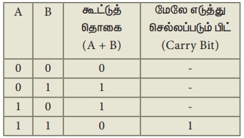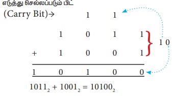 1 + 1 = 10 என்பதில், 0-வை மட்டும் வைத்துக்கொண்டு, 1-னை அடுத்த சுற்றுக்கு எடுத்து செல்ல வேண்டும். எனவே இது எடுத்து