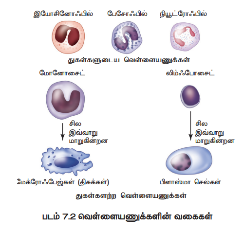 இரத்த வெள்ளை அணுக்கள், உட்கருக்களைக்கொண்ட நிறமற்ற, அமீபாய்டு வடிவம் மற்றும் இயக்கம் உடையச் செல்களாகும். மேலும் இவை ஹீமோகுளோபின் மற்றும் இதர நிறமிகளற்றவை. ஒரு சராசரி நலமான மனிதனில் ஒரு கன மில்லிமீட்டர் இரத்தத்தில் ஏறத்தாழ 6000 முதல் 8000 இரத்த வெள்ளையணுக்கள் காணப்படுகின்றன. வெள்ளையணுக்களின் வகைகளைப் படம் 7.2ல் காணலாம். வெள்ளை அணுக்களைத் துகள்களின் அடிப்படையில் இரு முக்கியப் பிரிவுகளாகப் பிரிக்கலாம். அவை, துகள்களுடைய (Granulocytes) மற்றும் துகள்களற்ற வெள்ளையணுக்கள் (Agranulocytes) ஆகும்.
