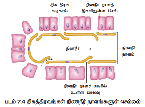 இரத்த நுண் நாளங்களிலிருந்து திசுக்களுக்குள் கசியும் 90% திரவம் மீண்டும் இரத்த நுண்நாளங்களுக்குள்ளேயே நுழைகின்றன. எஞ்சிய 10% திரவத்தை நிணநீர் நாளங்கள் (Lymph vessels) இரத்தக்குழாய்களுக்குக் கொண்டு செல்கிறது. நிணநீர் நாளங்களில் உள்ள திரவத்திற்கு நிணநீர் என்று பெயர். நிணநீர் மண்டலம், ஒரு சிக்கலான மெல்லிய சுவருடைய குழல்களாலான வலைப்பின்னல் (Lymphatic vessels) அமைப்பையும், வடிகட்டும் உறுப்புகளையும் (நிணநீர் முடிச்சு - Lymph nodes) மற்றும் அதிக எண்ணிக்கையில் வெவ்வேறு நிணநீர் உறுப்புகளிலுள்ள நோய் எதிர்ப்பாற்றல் தன்மை (Lymphocytic cells) மிக்க செல்களையும் உள்ளடக்கியதாகும். நிணநீர் குழல்கள் மென்மையான சுவரினால் ஆக்கப்பட்டுள்ளன. இவை தோல், சுவாசப்பாதை மற்றும் உணவுப்பாதையில் உள்ள இரத்தக் குழாய்களை ஒட்டி அவற்றுக்கு இணையாகச் செல்கின்றன. இரத்த நுண் நாளங்களிலிருந்து உடல் திசுக்களுக்குள் தொடர்ந்து ஊடுருவும் திரவங்களை இரத்தத்திற்குத் திரும்பச் செலுத்தும் குழல்களாக நிணநீர் குழல்கள் செயல்படுகின்றன. ஒரு நிணநீர்குழலின் முனைப்பகுதி படம் 7.4ல் காணலாம்.