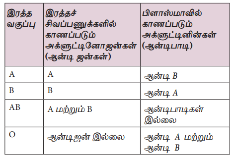 இரத்தச் சிவப்பணுக்களின் மேற்புறப் படலத்தில் இருக்கும் அல்லது இல்லாத எதிர்ப்பொருள் (ஆன்டிஜன்) (antigens) அடிப்படையில் A, B, AB மற்றும் O என நான்கு வகைகளாக இரத்தத்தை வகை படுத்தலாம். A, B மற்றும் O பிரிவு மனிதர்களின் இரத்தப் பிளாஸ்மாவில் இயற்கையாகவே எதிர்வினைப் பொருள்கள் (ஆன்டிபாடி) (Antibodies/ agglutinins) உள்ளன. சிவப்பணுவின் மேற்புறப் படலத்தில் உள்ள ஆன்டிஜென்களுக்கு அக்ளுட்டினோஜன்கள் (Agglutinogens) என்று பெயர். அக்ளுட்டினோஜன் A மீது செயல்படும் எதிர்வினைப் பொருட்களுக்கு ஆன்டி A (Anti A) எதிர்பொருள் என்றும், அக்ளுட்டினோஜன் B மீது செயல்படுபவை ஆன்டி B (Anti B) எதிர்பொருள் எனவும் அழைக்கப்படும். O வகுப்பு இரத்தத்தில் எந்த ஒரு அக்ளுட்டினோஜனும் காணப்படுவதில்லை. AB வகுப்பு இரத்தத்தில் அக்ளுட்டினோஜன் A மற்றும் அக்ளூட்டினோஜன் B ஆகிய இரண்டும் உள்ளன. ஆனால், ஆன்டி A மற்றும் ஆன்டி B எதிர்வினைப்பொருள்கள் காணப்படுவதில்லை. ஆன்டிஜென் மற்றும் எதிர் வினைப்பொருள் அடிப்படையிலான மனித இரத்த வகைகள் அட்டவணை 7.1 ல் கொடுக்கப்பட்டுள்ளது. ABO இரத்த வகுப்பு முறையில் A,B மற்றும் O என அல்லீலிக் ஜீன்கள் (Allelic genes) உள்ளன. அனைத்து வகை அக்ளுட்டினோஜன்களும் சுக்ரோஸ், D- காலக்டோஸ், N-அசிட்டைல் குளுக்கோஸமைன் மற்றும் 11 முனை அமினோ அமிலங்கள் (terminal amino acids) ஆகிய பொருட்களைக்கொண்டுள்ளன.முனைஅமினோ அமிலங்களின் இணைவு என்பது அதில் உள்ள A மற்றும் B ஜீன்களின் உற்பத்திப் பொருள்களைச் சார்ந்துள்ளது. இவ்வினையில் கிளைக்கோஸில் டிரான்ஸ்பெரேஸ் (Glycosyl transferase) எனும் நொதி வினையூக்கியாகச் செயல்படுகிறது.