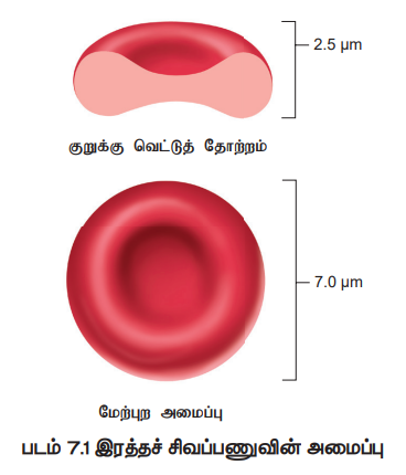 இரத்தச் செல்களில் இரத்தச் சிவப்பு அணுக்களே மிக அதிக அளவில் காணப்படுகின்றன. ஒரு ஆரோக்கியமான ஆணின் இரத்தத்தில் ஒரு கன மில்லிமீட்டருக்குச் ஏறத்தாழ 5 முதல் 5.5 மில்லியன் சிவப்பணுக்களும் பெண்ணின் இரத்தத்தில், ஒரு கன மில்லிமீட்டருக்கு ஏறத்தாழ 4.5 முதல் 5.0 மில்லியன் சிவப்பணுக்களும் காணப்படுகின்றன. இரத்தச் சிவப்பணுவின் அமைப்பைப் படம் 7.1 காட்டுகிறது. இரத்தச் சிவப்பணுக்கள் ஏறத்தாழ 7μm (மைக்ரோமீட்டர்) விட்டமுடைய மிகச்சிறிய செல்களாகும். இரத்தச் சிவப்பணுக்களின் நிறத்திற்குக் காரணம் அதிலுள்ள சுவாச நிறமியான ஹீமோகுளோபின், சைட்டோப்பிளாசத்தில் கரைந்த நிலையில் காணப்படுவதேயாகும். சுவாச வாயுக்களைக் கடத்துவதில் ஹீமோகுளோபின் முக்கிய பங்காற்றுகிறது. அதுமட்டுமின்றி திசுதிரவத்துடனான வாயு பரிமாற்றத்திற்கும் இது காரணமாகின்றது.
