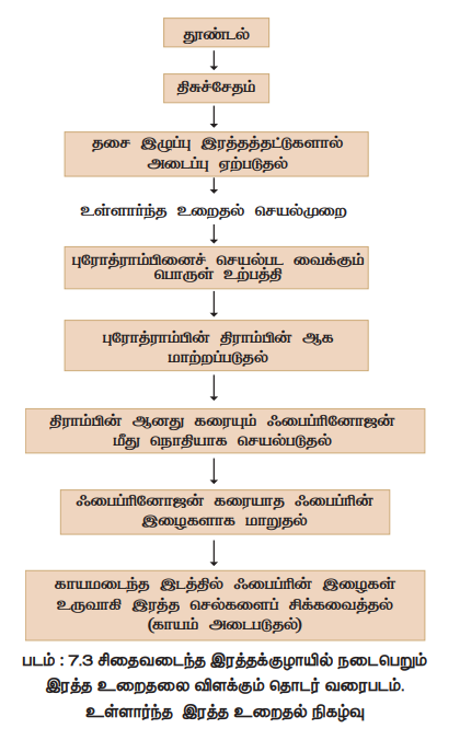 கால்சியம் அயனிகள் மற்றும் வைட்டமின் K ஆகியவற்றின் முன்னிலையில் செயல்படும் திராம்பினாக மாற்றமடைகிறது. திராம்பின், இரத்தப் பிளாஸ்மாவில் கரைந்த நிலையிலுள்ள ஃபைப்ரினோஜனை, கரையாத ஃபைப்ரின் இழைகளாக்குகின்றன. இவ்விழைகள் ஒன்றுக்கொன்று இணைந்து இரத்தச் செல்களைத் சூழ்ந்து ஒரு வலைப்பின்னல் அமைப்பை உண்டாக்குகிறது. மேலும் ஃபைப்ரின் வலைப்பின்னல் காயம்பட்ட இரத்தக் குழலில் குணமாகும் வரை அடைப்பை ஏற்படுத்தி இரத்தம் வெளியேறாமல் தடுக்கிறது. சிறிது நேரத்திற்குப் பிறகு ஃபைப்ரினில் உள்ள நுண்ணிழைகள் சுருங்கி வெளிர் மஞ்சள் நிறச் சீரம் எனும் திரவத்தை வலைப்பின்னல் வழியே வெளியேற்றுகின்றது. சீரம் (Serum) என்பது ஃபைப்ரினோஜன் இல்லாத பிளாஸ்மாவாகும். இரத்த உறைதலைத் தடைசெய்யும் இரத்த உறைவு எதிர்ப்பொருளான (Anticoagulant) ஹிப்பாரின், இணைப்புத் திசுக்களிலுள்ள மாஸ்ட் செல்களினால் உருவாக்கப்படுகிறது. இது சிறிய இரத்தக்குழாய்களில் இரத்த உறைதலைத் தடைசெய்கிறது.