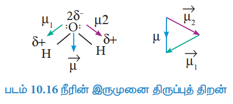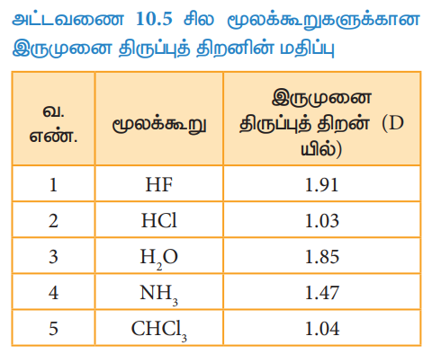 அட்டவணை 10.5 சில மூலக்கூறுகளுக்கான இருமுனை திருப்புத் திறனின் மதிப்பு