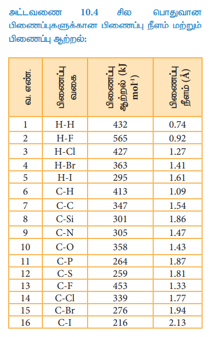 அட்டவணை 10.4 சில பொதுவான பிணைப்புகளுக்கான பிணைப்பு நீளம் மற்றும் பிணைப்பு ஆற்றல்: