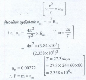 11. புவி மற்றும் நிலவு இவற்றிற்கிடையேயான ஈர்ப்பு விசை கண்ணுக்குப் புலப்படாத அவற்றை இணைக்கும் மெல்லிய கயிற்றின் வழி அளிக்கப் படுகிறது என்று கருதுக. புவி நிலாவிற்கு அளிக்கும் மையநோக்கு முடுக்கத்தால் ஏற்படும் இழு விசையை கணக்கிடுக.