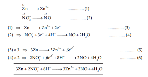 (5) + (6) ⇒ 3Zn + 2NO3− + 8H+ → 3Zn2+ + 2NO + 4H2O
