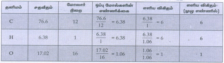 42) 76.6% கார்பன் 6.38% ஹைட்ரஜன், மீத சதவீதம் ஆக்ஸிஜனையும் கொண்ட சேர்மத்தின் எளிய விகித வாய்பாடு, மூலக்கூறு வாய்பாடு ஆகியவற்றைக் காண்க. சேர்மத்தின் ஆவி அடர்த்தி 47.