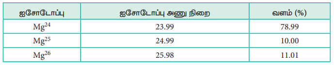 தீர்வு: சராசரி அணுநிறை = [ (78.99 × 23.99) + (10 × 24.99) + (11.01 × 25.98) ] / 100
