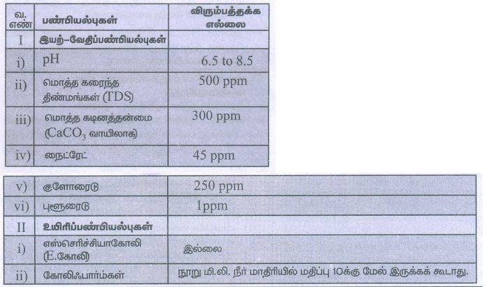27. இந்திய தரநிலை அமைச்சகத்தால் பரிந்துரைக்கப்பட்ட குடிநீருக்கான தரநிலை அளவுகளை குறிப்பிடுக.