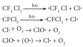 32. CFC மூலக்கூறுகள், அடுக்குமண்டலத்தில் ஓசோன் படல சிதைவை எவ்வாறு உண்டாக்குகின்றன என்பதை நிகழும் வினைகளின் அடிப்படையில் விளக்குக.