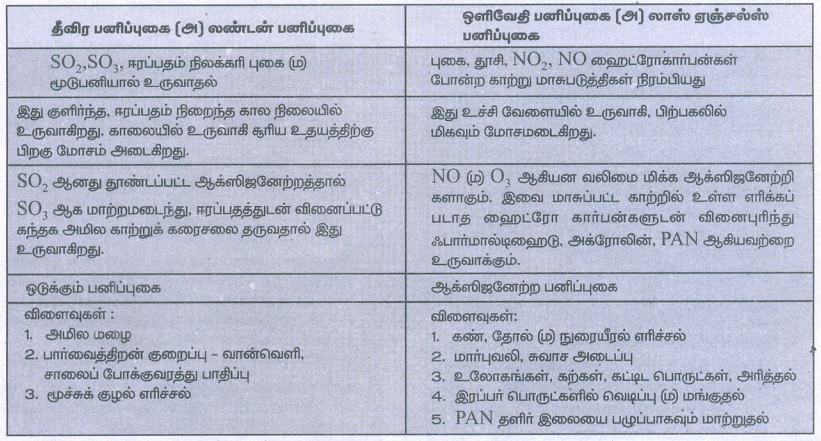 28. பனிப்புகை என்றால் என்ன? தீவிர பனிப்புகை எவ்வாறு ஒளிவேதிப் பனிப்புகையிலிருந்து வேறுபடுகிறது?