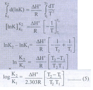 சமன்பாடு (4) ஐ T1 மற்றும் T2 மற்றும் அவ்வெப்ப நிலைகள் சமநிலை மாறிலிகள் முறையே K1 மற்றும் K2 ஆகிய எல்லைகளுக்கிடையே தொகையீடு செய்க.