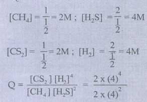 43. 500ml குடுவையில் 1 மோல் CH4 , 1மோல் CS2 , 2 மோல் H2S மற்றும் 2 மோல் H2 கலக்கப்படுகிறது. இவ்வினையின் சமநிலை மாறிலி KC = 4×10-2 mol2 lit-2. இவ்வினையானது சமநிலையை அடைய எந்த திசையில் நகரும்?