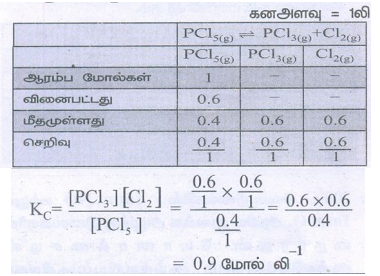 40. ஒரு லிட்டர் கனஅளவுடைய ஒரு மூடியகலனில், ஒரு மோல் PCl5 வெப்பப்படுத்தப்படுகிறது. சமநிலையில் 0.6 மோல் குளோரின் இருந்தால் சமநிலைமாறிலியின் மதிப்பினைகணக்கிடுக.