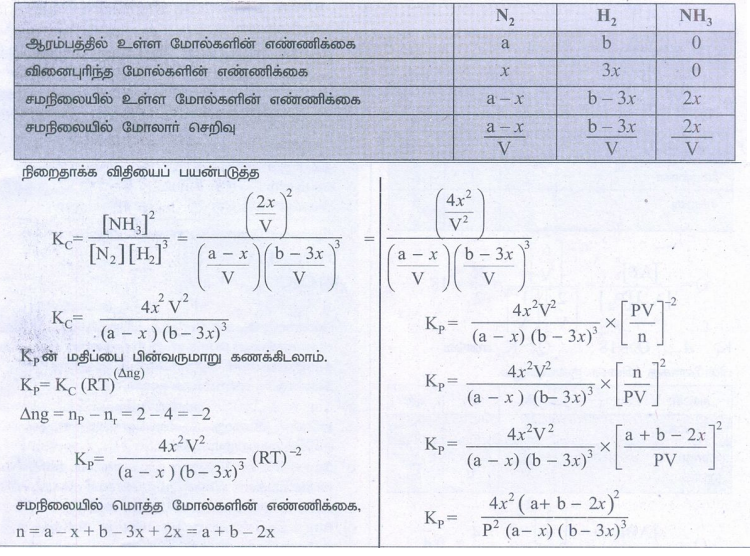 'a' மோல் நைட்ரஜன் மற்றும் ‘b' மோல் ஹைட்ரஜன் ஆகியன 'V' கனஅளவுள்ள ஒரு கலனில் எடுத்துக் கொள்ளப்பட்டு அம்மோனியா உருவாக்கப்படும் வினையைக் கருதுக. 'x' மோல் நைட்ரஜன் '3x' மோல் ஹைட்ரஜனுடன் வினைபுரிந்து 2x மோல் அம்மோனியா உருவாகிறது என்க.