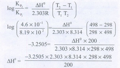 49. N2 (g) + 3H2 (g) ⇌ 2NH3(g) என்ற வினையில் 298K ல் Kp ன் மதிப்பு 8.19×102 மற்றும் 498K-ல் 4.6 × 10-1 ஆகும். வினைக்கான ΔHo னை கணக்கிடுக.