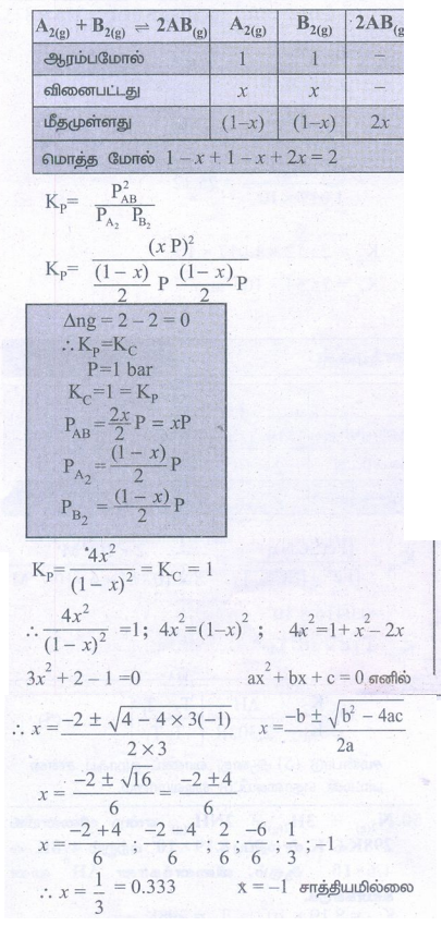47. மொத்த அழுத்தம் 1.00 bar மற்றும் 800Kல் 1 மோல் A2(g) மற்றும் மோல்B2 (g)யினை கொண்டு ஒரு மூடிய கலன் நிரப்பப்படுகிறது. சமநிலையில், கலவையிலுள்ள பகுதிப் பொருள்களின் அளவினை கணக்கிடுக. (கொடுக்கப்பட்டவை: வினையின் Kp மதிப்பு 1)