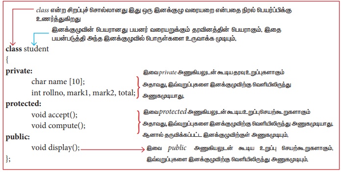 Private, Protected மற்றும் Public என்ற சிறப்புச் சொற்களானது அணுகியல்பு வரையறுப்பிகள் என அழைக்கப்படுகின்றன. இனக்குழு உறுப்புகளின் கொடாநிலை அணுகியல்பானது Private ஆகும்.