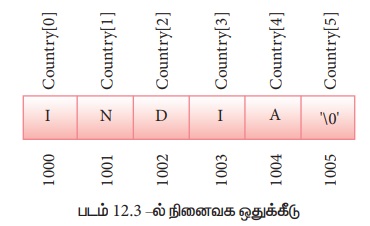 மேற்கண்ட எடுத்துக்காட்டில் ஒவ்வொரு குறியுருவும் நினைவகத்தில் ஒரு பைட் எடுத்துக்கொள்ளும். சரத்தின் இறுதியில், நிரல்பெயர்ப்பி தானாகவே ஒரு வெற்று குறியுருவை அதன் இறுதியில் இணைத்துக்கொள்ளும்.