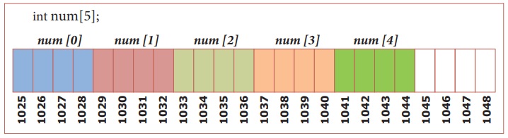 கீழே கொடுக்கப்பட்டுள்ள படம் ஐந்து உறுப்புகளைக் கொண்ட அணியின் நினைவக ஒதுக்கீட்டை காட்டுகின்றது.