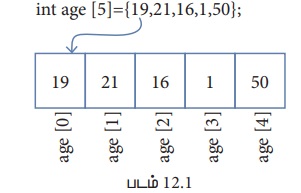 மேற்கண்ட எடுத்துக்காட்டில் ‘age' என்ற அணியின் அளவானது 5 ஆகும். இதில் முதல் உறுப்பு age[0]ல் 19 என்ற எண் சேமிக்கப்பட்டிருக்கும், உறுப்பு age[1]ல் 21 என்ற எண் சேமிக்கப்பட்டிருக்கும், இது போல மற்ற உறுப்புகளிலும் கொடுக்கப்பட்டுள்ள எண்கள் சேமிக்கப்பட்டிருக்கும். (பார்க்க படம் 12.1)