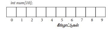 மேலே கொடுக்கப்பட்டுள்ள நிரலில் int num [5); என்பது 5 உறுப்புகளைக் கொண்ட ஒரு முழு எண் அணியாகும்.