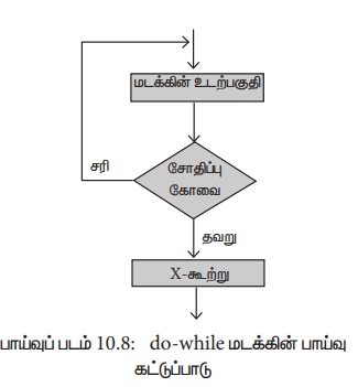 do-while மடக்கின் பாய்வுக் கட்டுப்பாடு மற்றும் பாய்வு படம் கீழே கொடுக்கப்பட்டுள்ளது.