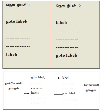 மேலே கொடுக்கப்பட்டுள்ள கட்டளை அமைப்பில், முகவரி என்பது குறிப்பெயராகும்- goto label; என்ற கூற்று இயக்கப்படும் போது கட்டுப்பாடு label: என்ற கூற்றினுக்கு தாவும் பின் அதற்கு கீழ் வரும் இடம் பெற்றுள்ள கூற்றுகள் இயக்கப்படும்.