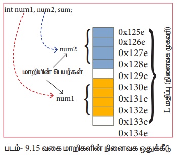 எடுத்துக்காட்டு : int num1, num2, sum;