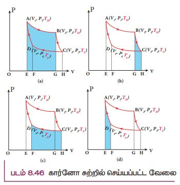 ஒரு முழு சுற்றுக்கு செயல்படு பொருளால் (நல்லியல்பு வாயு) செய்யப்பட்ட தொகுபயன் வேலை PV வரைபடத்தில் உள்ள ABCD என்ற மூடப்பட்ட வளைகோட்டினால் சூழப்பட்ட பரப்பிற்குச் சமம் என்பதை சமன்பாடு (8.60) காட்டுகிறது. இது படம் (8.48) இல் காட்டப்பட்டுள்ளது.