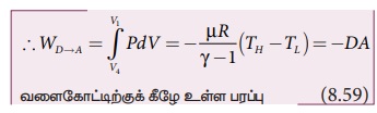 இந்த வெப்பப் பரிமாற்றமில்லா அமுக்கத்திலும் வாயுவின் மீது செய்யப்பட்ட வேலை எதிர்க்குறியாகும். இது படம் 8.46 (d) யில் காட்டப்பட்டுள்ளது.