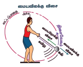 இச்செயலில் ஒரு இழு விசையானது மையத்திலிருந்து வெளிநோக்கிச் செயல்படுவதை உணர்ந்திருப்பீர்கள். இது மைய விலக்கு விசை என்று அழைக்கப்படும். வட்டப்பாதையின் மையத்திலிருந்து ஒரு பொருளின் மீது வெளிப்புறமாகச் செயல்படும் விசையே மையவிலக்கு விசை எனப்படும். ஆகவே,