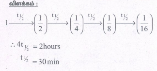 25. ஒரு கதிரியக்கத் தனிமமானது இரண்டு மணி நேரத்தில் அதன் ஆரம்ப அளவில் (1/16) மடங்காகக் குறைகிறது. அதன் அரைவாழ் காலம்