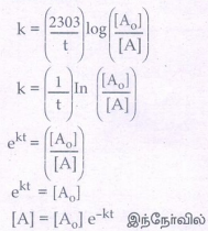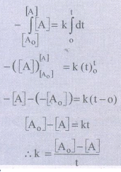 t = 0 எனும் போது செறிவு (A.]° மற்றும் t = t எனும் போது செறிவு[A] என அமையும் எல்லையில் மேற்கண்ட சமன்பாட்டை தொகையிட,