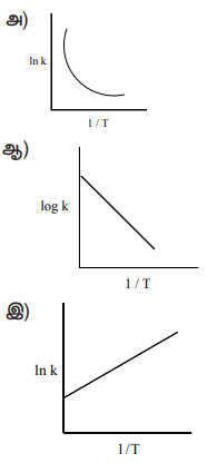 3. ஒரு வினையின் வினைவேக மாறிலி மற்றும் வெப்ப நிலைக்கு இடையேயான வரைபடம் பின்வருமாறு, இவற்றுள் வெப்பநிலை முழுமைக்கும் அர்ஹீனியஸ் தன்மையினைக் குறிப்பிடும் வரைபடம் எது?