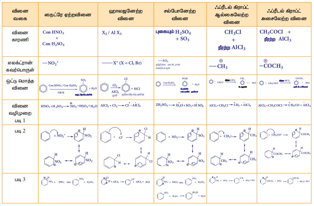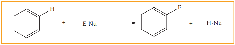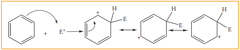 1. பென்சீன் உள்ளடங்கா π எலக்ட்ரான்களைப் பெற்றிருப்பதால் அதன் வளையமானது அதிக எலக்ட்ரான் அடர்வு கொண்ட மையமாக விளங்குகின்றது. எனவே பென்சீனில் எலக்ட்ரான் கவர்பொருள் பதிலீட்டு வினைகள் நடைபெறுகின்றன.