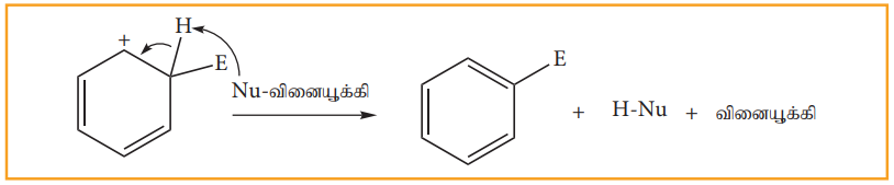 படி 2: எலக்ட்ரான் கவர்பொருள் அரோமேட்டிக் வளையத்தினை தாக்குவதால் கார்பன் நேர் அயனி இடைநிலை உருவாகிறது இது உடனிசைவால் நிலைப்புத்தன்மையினைப் பெறுகின்றது