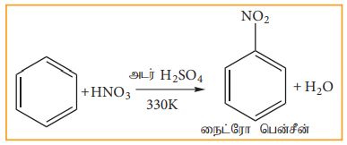 பென்சீனை 330K வெப்பநிலையில் (அடர் HNO3 மற்றும் அடர் H2SO4) அடங்கிய நைட்ரோ ஏற்ற கலவையுடன் வெப்பப்படுத்தும் போது பென்சீனில் உள்ள ஹைட்ரஜன் நைட்ரோனியம் அயனியால் NO2+ ஆல் பதிலீடு செய்யபட்டு நைட்ரோ பென்சீன் உருவாகிறது.