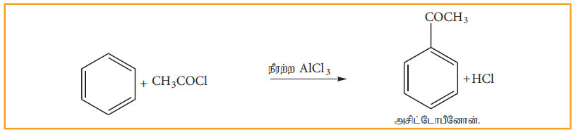 பென்சீனை அசிட்டைல் குளோரைடுடன் நீரற்ற AlCl3 முன்னிலையில் வினைப்படுத்தும் போது அசிட்டைல் பென்சீன் உருவாகிறது.