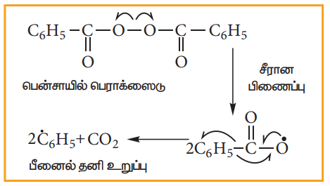பெராக்சைடில் உள்ள, வலிமை குறைந்த O-O ஒற்றைப் பிணைப்பு சீர்மையான பிளப்பிற்கு உட்பட்டு தனி உறுப்புக்களை உண்டாக்குகின்றது.