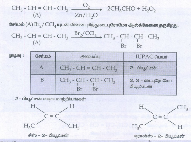 சேர்மம் (A) ஓசோனேற்றமடைந்து அசிட்டால்டிஹைடை தருவதால் – சேர்மம் (A) ஒரு சீர்மையுள்ள ஆல்கீன் ஆகும். எனவே A-2 – பீயூட்டீன் ஆகும்.