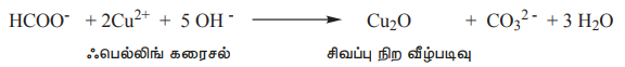 ii) ஃபார்மிக் அமிலம், ஃபெல்லிங் கரைசலை ஒடுக்குகிறது. இது நீல நிற குப்ரிக் அயனிகளை சிவப்பு நிற குப்ரஸ் அயனிகளாக ஒடுக்குகிறது.
