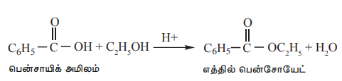 iii) கார்பாக்சிலிக் அமிலத்தை, ஆல்கஹால் மற்றும் அடர் H2SO4 உடன் சேர்த்து வெப்பப்படுத்தும்போது அவை எஸ்டரை உருவாக்குகின்றன. இந்த எஸ்டரானது அதன் பழ நறுமணத்தால் கண்டறியப்படுகிறது.