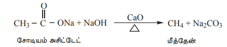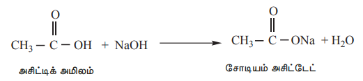 ii) கார்பாக்சிலிக் அமிலங்களை, சோடியம் பைகார்பனேட் கரைசலுடன் சேர்க்கும்போது நுரைத்த பொங்குதலுடன் கார்பன் டை ஆக்சைடு வெளிவருகிறது.