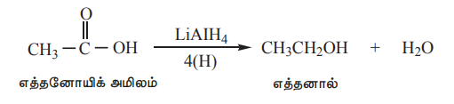 கார்பாக்சிலிக் அமிலங்கள், LiAlH, அல்லது காப்பர் குரோமைட் வினைவேக மாற்றி முன்னிலையில் ஹைட்ரஜனுடன் சேர்ந்து ஒடுக்கமடைந்து ஓரிணைய ஆல்கஹால்களாக மாறுகின்றன. சோடியம் போரோஹைட்ரைடு –COOH தொகுதியை ஒடுக்குவதில்லை.