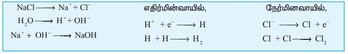 மின்னாற்பகுத்தல் செயல்முறை சோடியம் குளோரைடு (NaC1) கரைசலை மின்னாற்பகுக்கும் போது Na+ மற்றும் C1- அயனிகள் உருவாகுகின்றன. உருவாகும் Na+ அயனிகள் நீரின் OH- அயனிகளோடு சேர்ந்து சோடியம் ஹைட்ராக்சைடை தருகிறது. ஹைட்ரஜன் மற்றும் குளோரின் ஆகிய வாயுக்கள் வெளியேறுகின்றன.