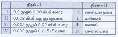 10. நிரல் I ல் மண்ணின் அளவும், நிரல் II ல் மண்ணின் ஒப்பீட்டளவும் கொடுக்கப்பட்டுள்ளது. கீழ்கண்டவற்றில் நிரல் 1 மற்றும் நிரல் II ல் சரியாகப் பொருந்தியுள்ளவற்றைக் கண்டுபிடிக்கவும்.